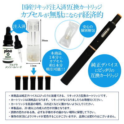 カートリッジにはメンソールのリキッドが注入されているので、装着すればそのまま利用可能! ※プルームテックプラス本体は別売りとなっております 【メンソール互換カートリッジ】 本商品はプルームテックプラスにぴったりと装着できる、リキッド入り互換カートリッジとなります。