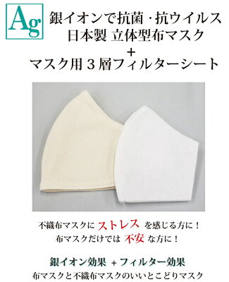 銀イオンマスク+3層フィルター5枚入り 不織布マスク 抗ウイルス・抗菌マスク 日本製 ポケット Ag 消臭 立体型マスク 布マスク 洗える ガーゼ