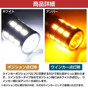 商品説明 ツインカラーバルブ 5630SMD 計42連 ウィンカーポジションキット ■取付簡単!ダブル球へ 純正シングル球をダブル球に変換するソケットが付属しており、 バルブ形状が同じであれば、殆どのお車に取り付け可能です。