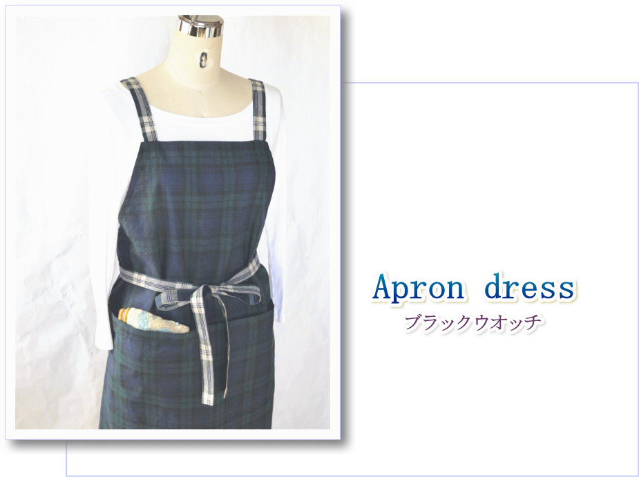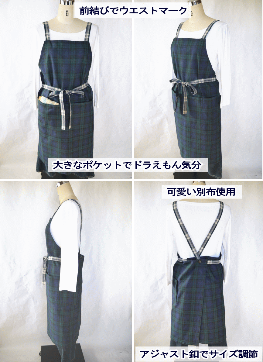 ・ポケットの深さはすっぽり手が入り、単行本も楽に入ります ・前で結んでウエストマーク長いヒモで男女兼用サイズ ・素材はブラックウオッチ×同柄色違いの組み合わせ ※濃色は色落ちします。