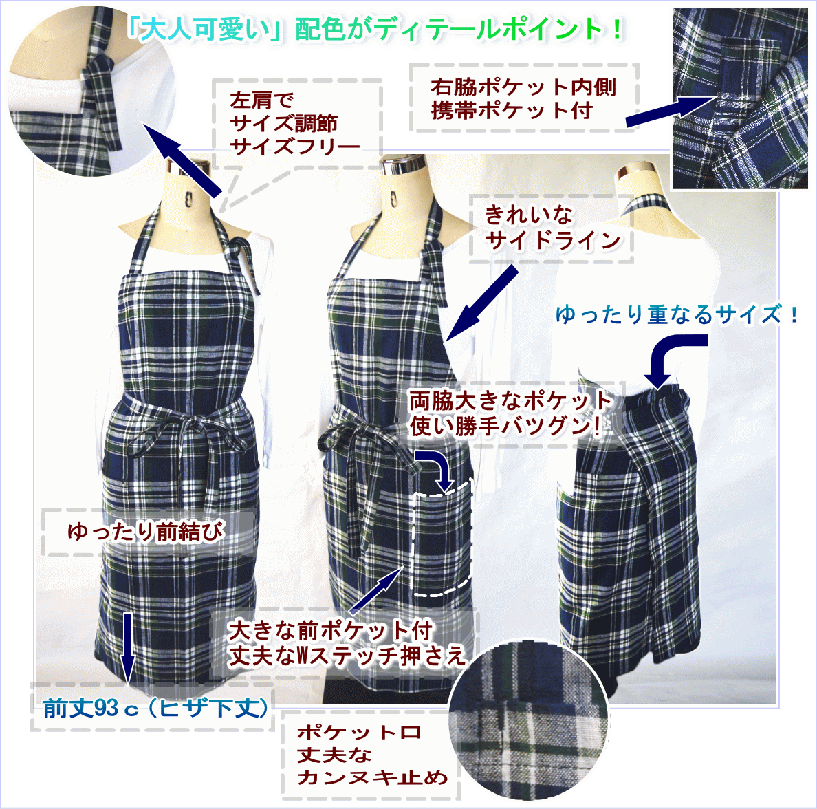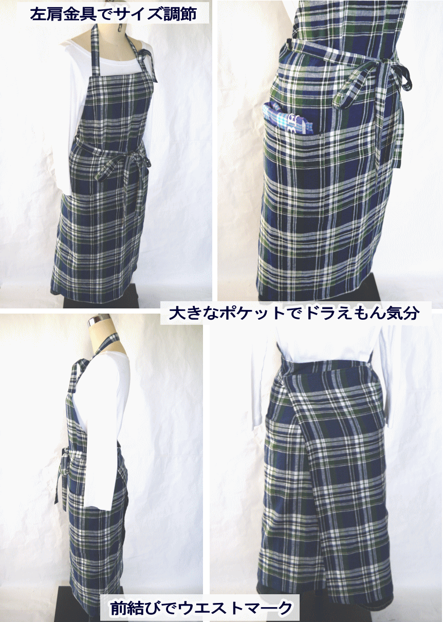 ・ポケットの深さはすっぽり手が入り、単行本も楽に入ります ・前で結んでウエストマーク長いヒモで男女兼用サイズ ・大きな前脇ポケット付、右ポケット内側に携帯ポケット付 携帯電話だけでなく 重みのあるキーホルダーなどを表に 響かないように収納できます ・素材はベルギー麻と先染め綿との混紡タータンチェック素材 ポケットの深さはすっぽり手が入る大きさ 大人可愛いは小さなディテールの積み重ね 【 素材情報 】 *モニターによって実際の色と異なる場合があります。