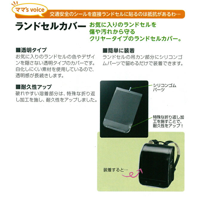 」 というママの声にお応えして、あんふぁんモデルの ランドセルカバー(クリヤータイプ)が登場! お気に入りのランドセルを傷や汚れから守るクリヤータイプのランドセルカバー ●破れにくさを追求 ランドセルの差し込み部分に切り込みを入れることで、 装着時にかかる力を逃し破れにくい加工をしています。