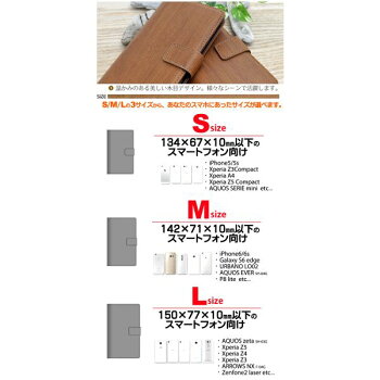 対応機種【Lサイズ】縦150×横77×厚み10mm以下のスマートフォン・AQUOS zeta(SH-03G)・Xperia Z4 ・Xperia Z3・ARROWS NX(F-04G) ・Zenfone2 laserなど【Mサイズ】縦142×横71×厚み10mm以下のスマートフォン・iPhone7/6s/6 ・Galaxy S6 edge ・URBANO LO02 ・AQUOS ever ・P8 liteなど【Sサイズ】縦134×横67×厚み10mm以下のスマートフォン・iPhone5/5s ・Xperia Z3Compact ・Xperia A4 ・AQUOS SERIE miniなど※機種によってはカメラは使用できない場合があります。